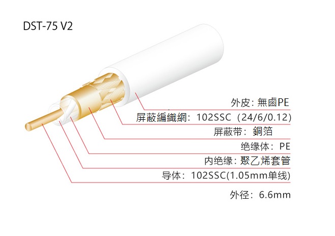 “DST-75R V2”採用精密導體102 SSC作為中心導體和編織屏蔽層。